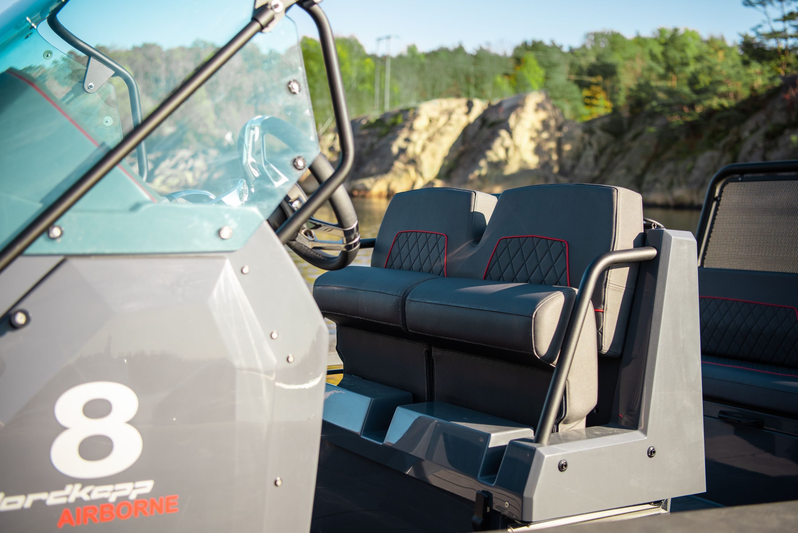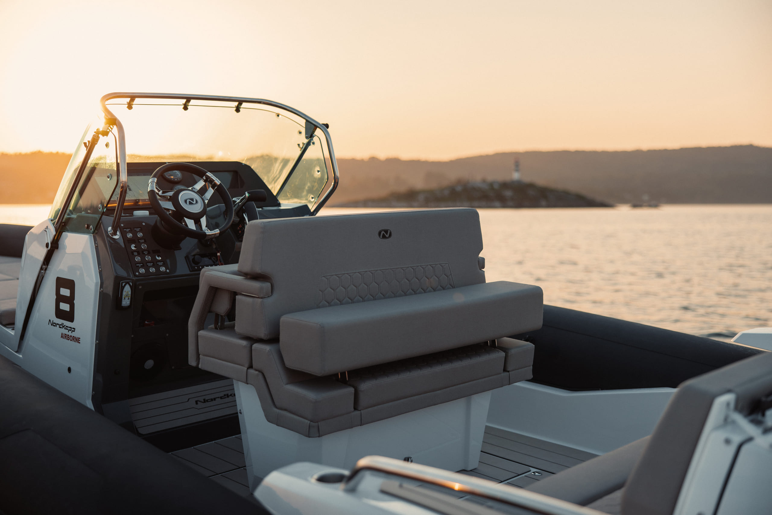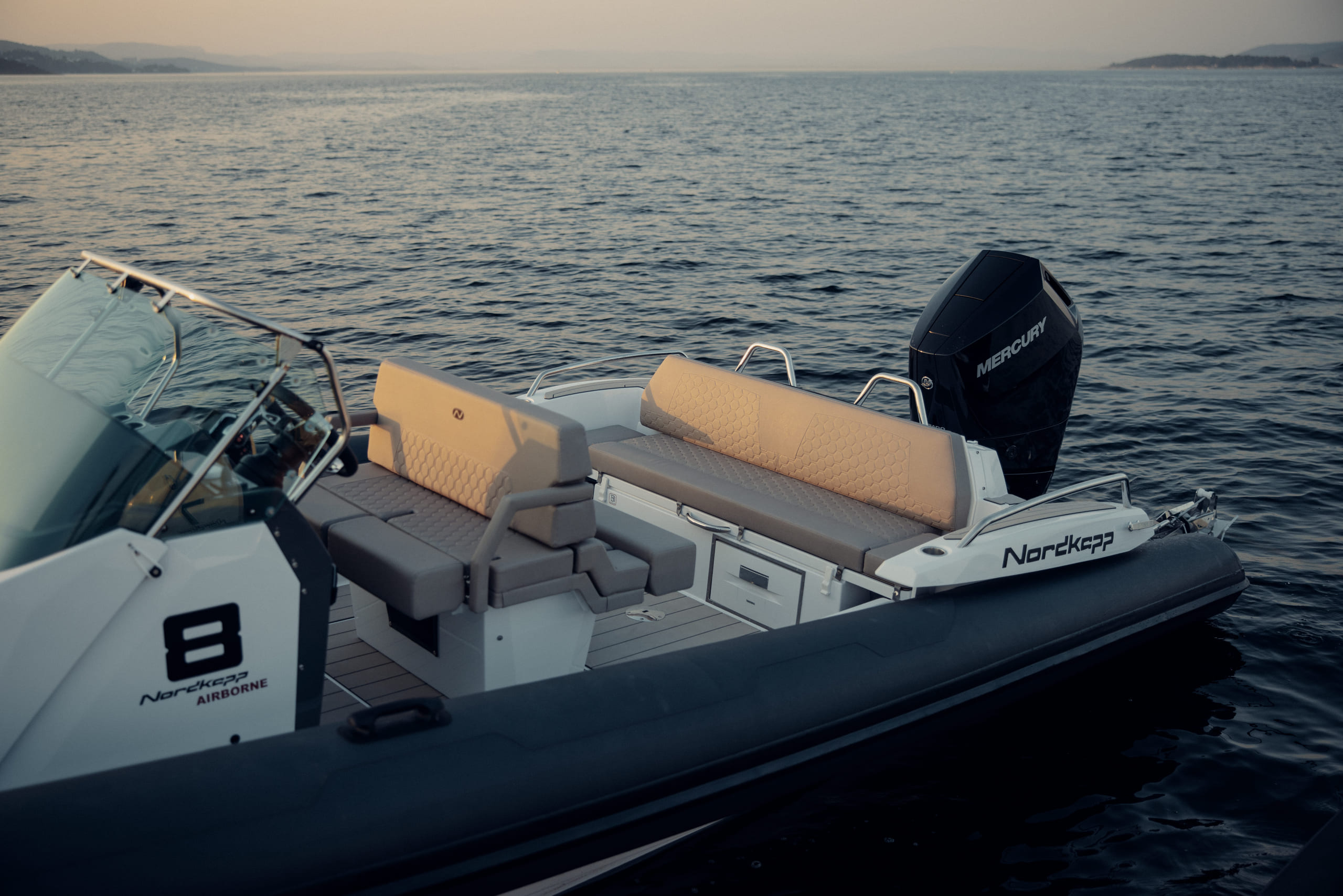 Nordkapp Airborne 8 er en sportslig RIB med fokus på komfort, kjøreglede og båtglede. Båtens skrog og design gir deg en unik kontroll, selv når forholdene blir utfordrende. Båten er laget med fokus på ulike komfortsoner, avhengig av når på året og hvordan du ønsker å bruke din Airborne 8. I baugen finner du et solid trinn for å gå ombord eller i land, stor solseng for varme sommerdager og en komfortabel sittebenk på fremsiden av konsollen.