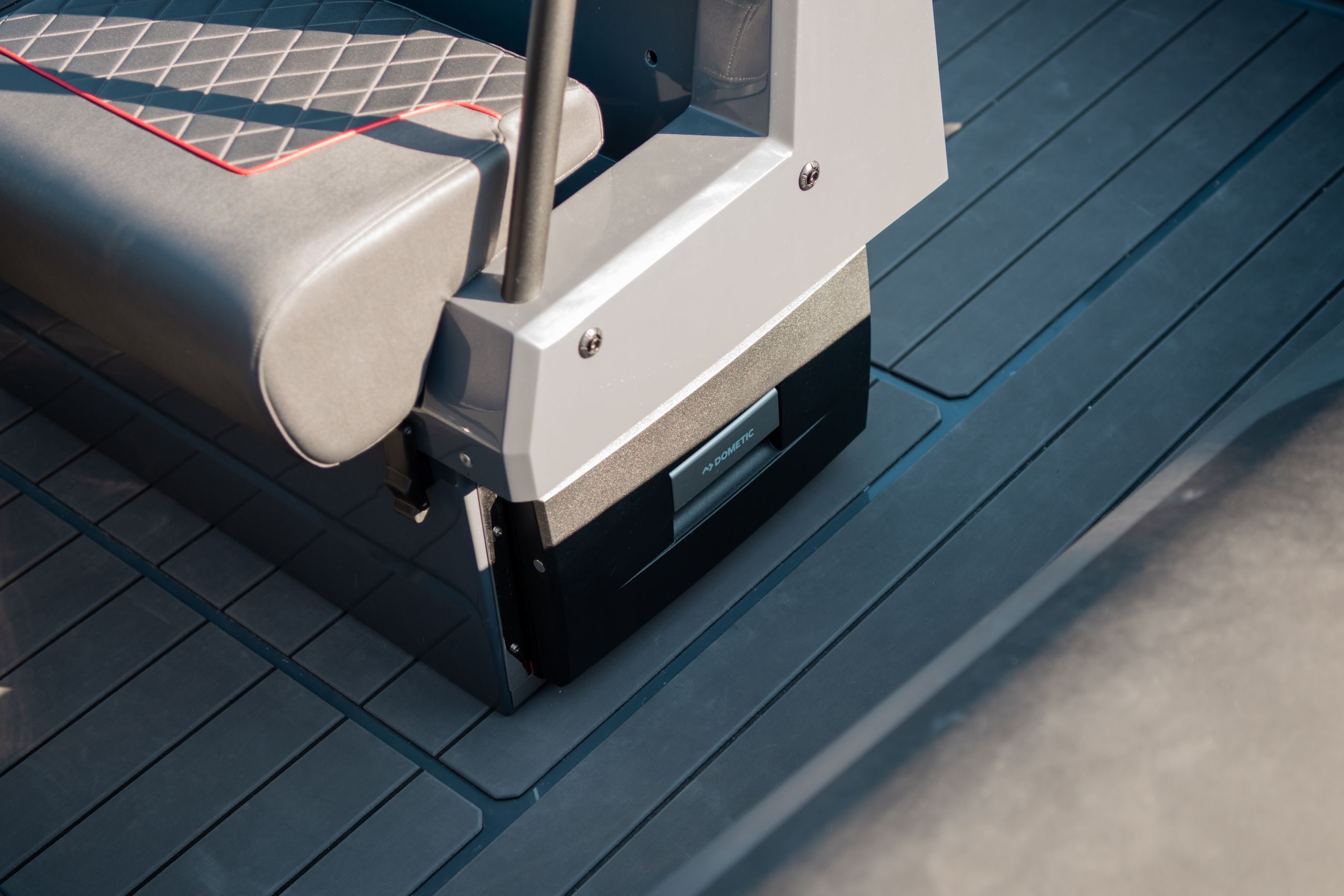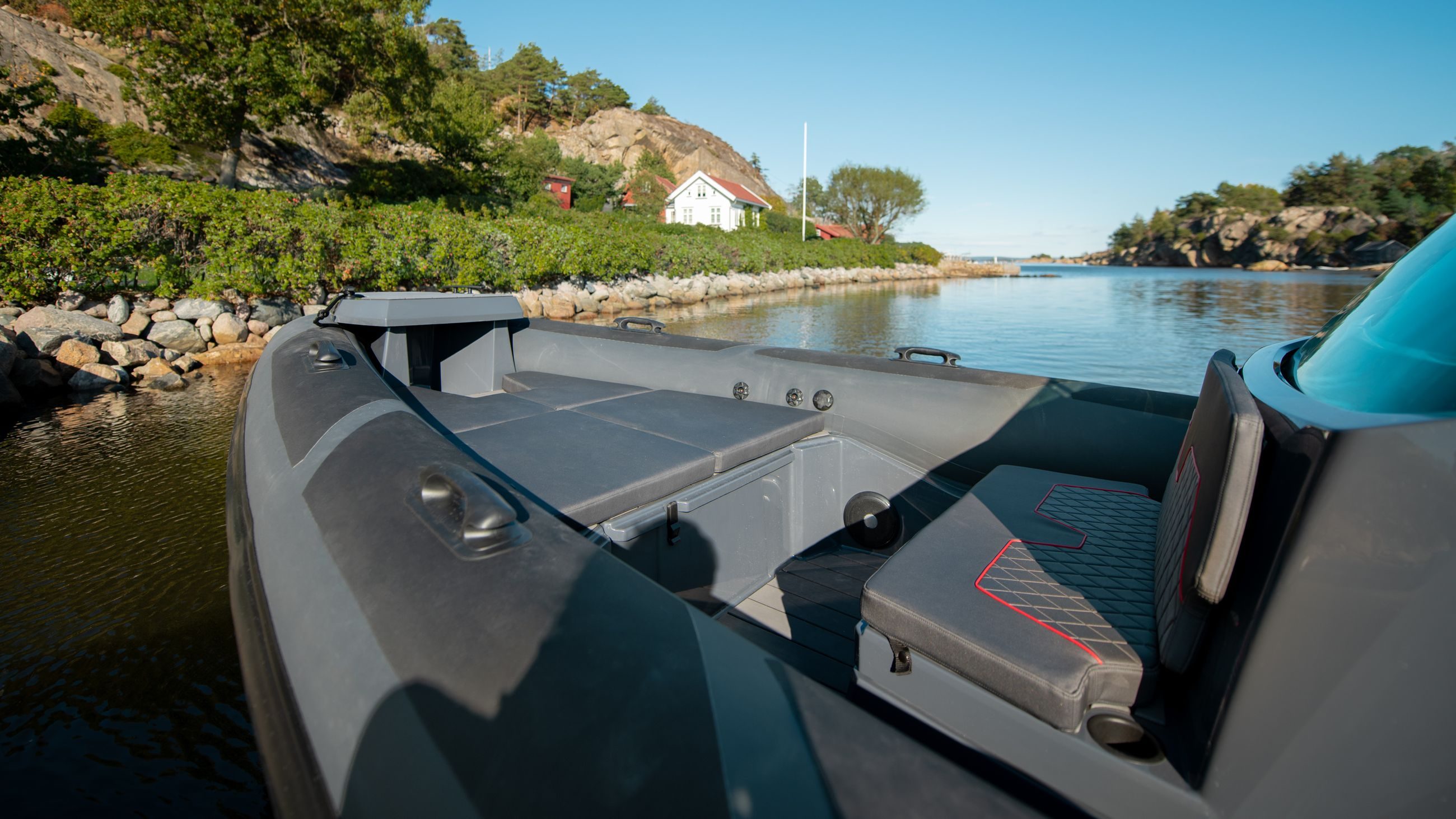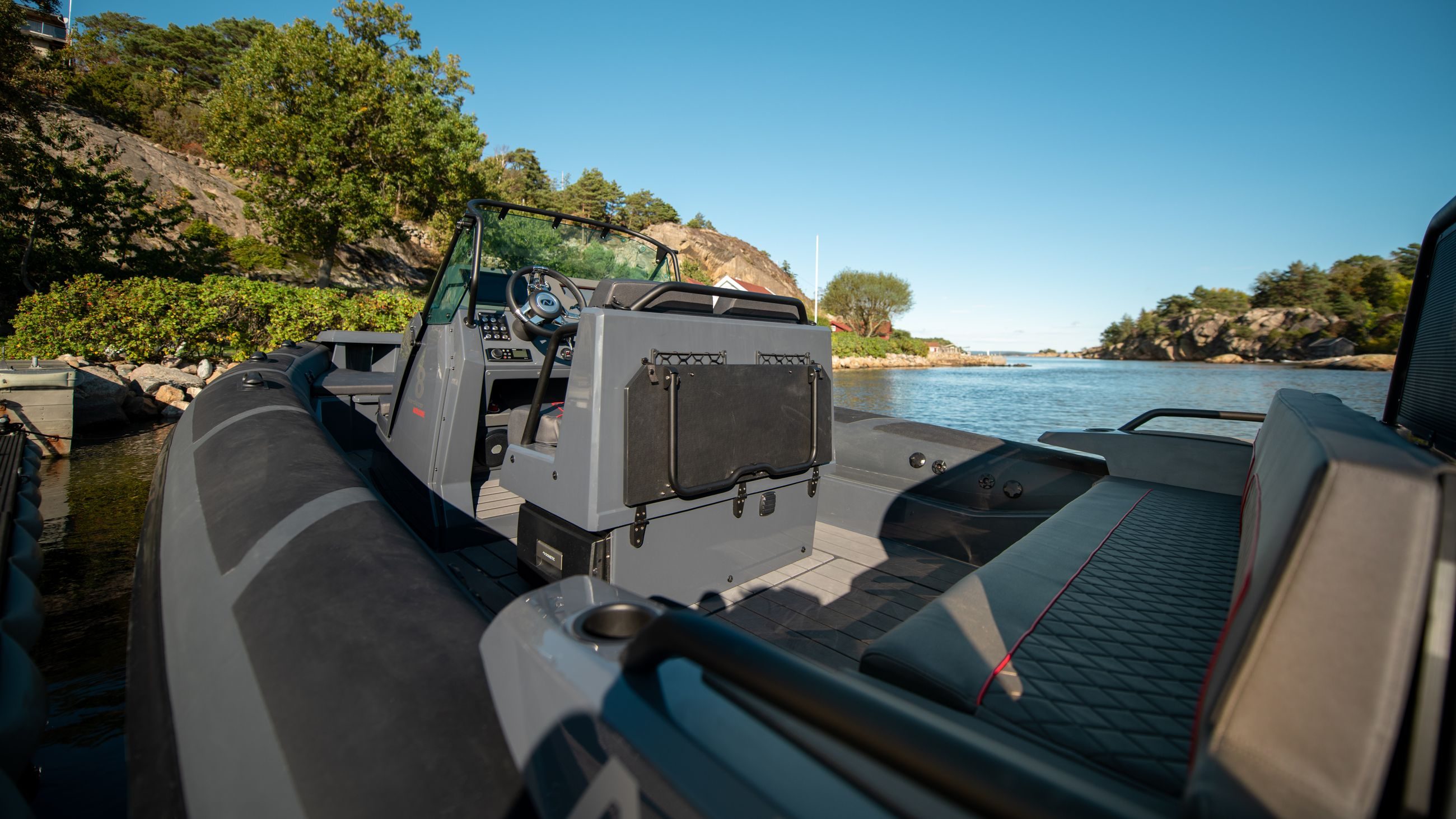 Konsollen kan også leveres med sprayhood og hel kalesje, som dekker fører og passasjer i cockpit. Dette gjør at Airborne 8 er en RIB som tåler mye vær, og vi har lagt til rette for at du skal kunne bruke båten hele året. Under førerbenken finner du båtens kjøleboks hvis du velger å legge til dette som utstyr.