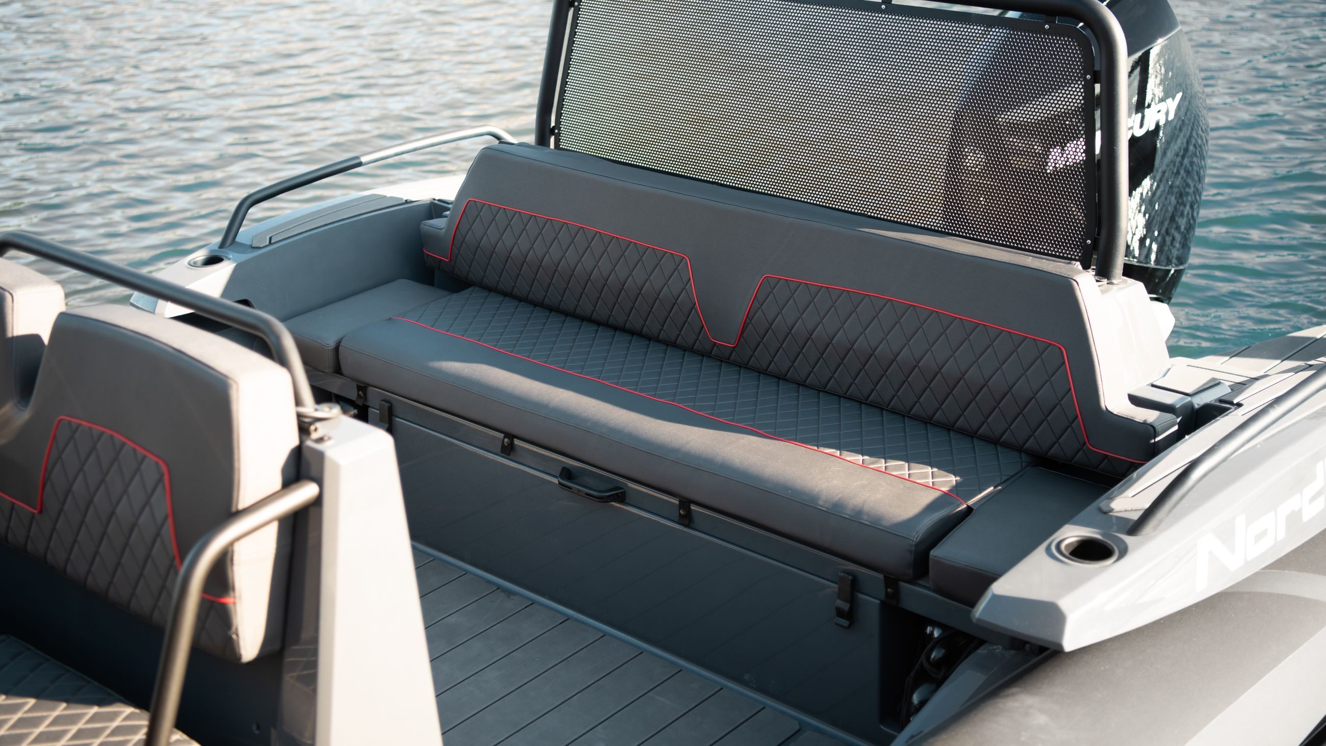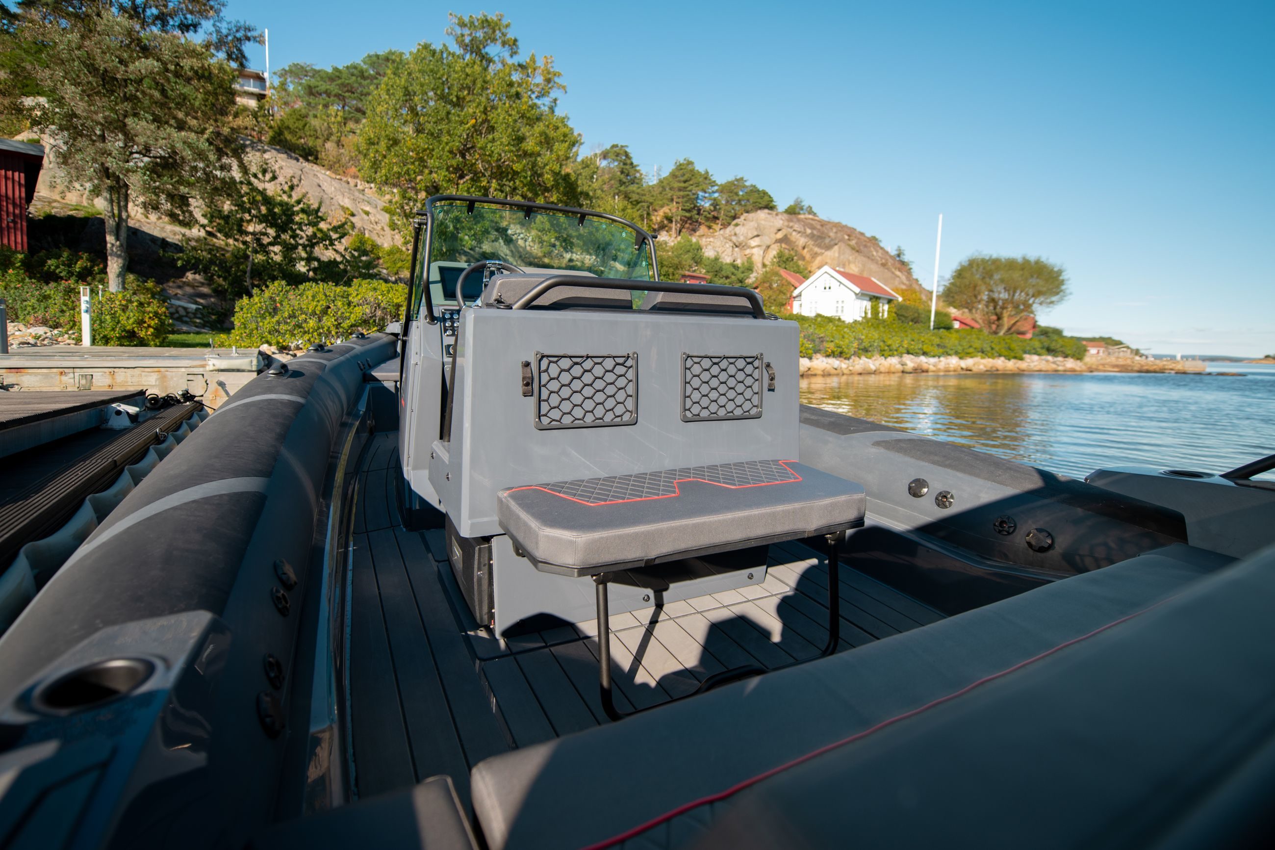 Akterdekket på Airborne 8 er stort og med god plass til familie og venner. Med nedfellbar sittebenk (ekstrautstyr) mot cockpit og en bred og god akterbenk får du plass til 5-6 personer.