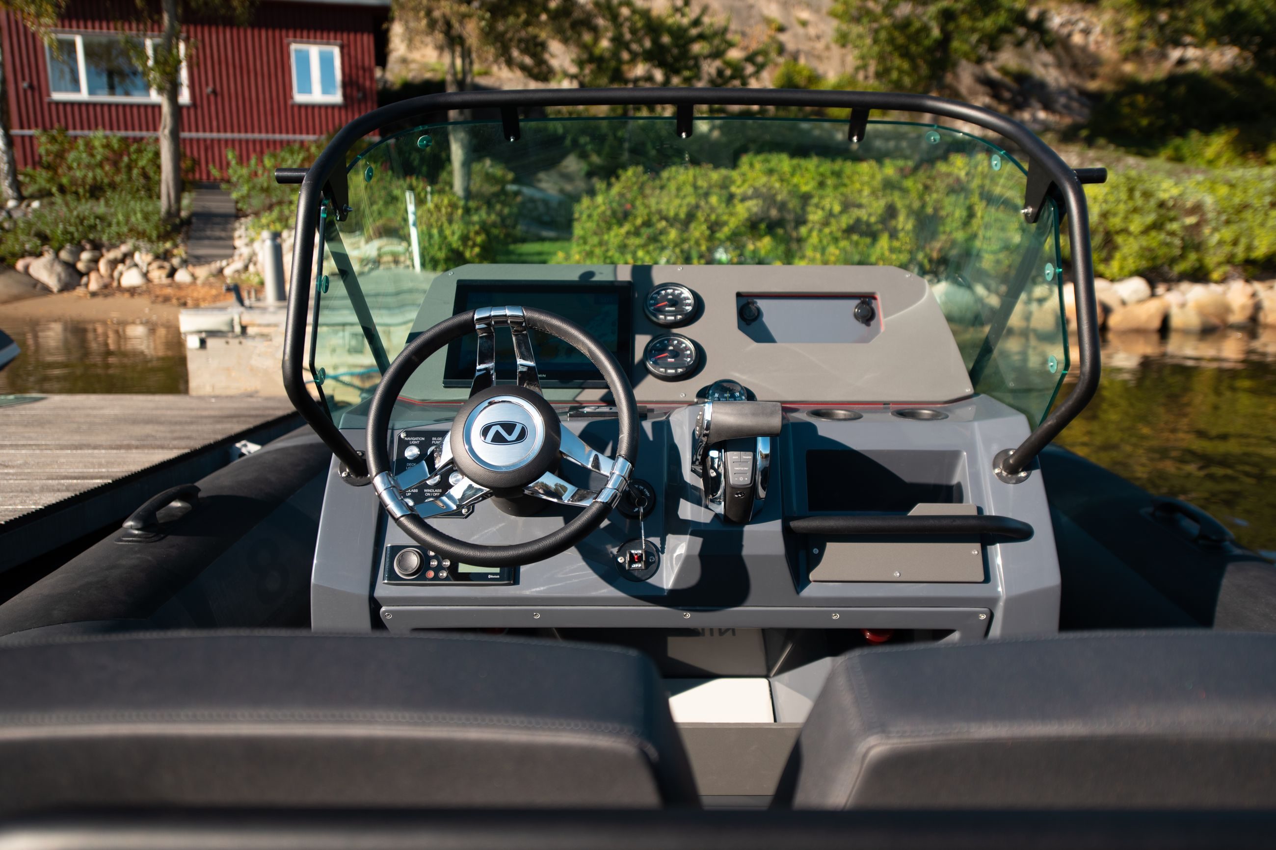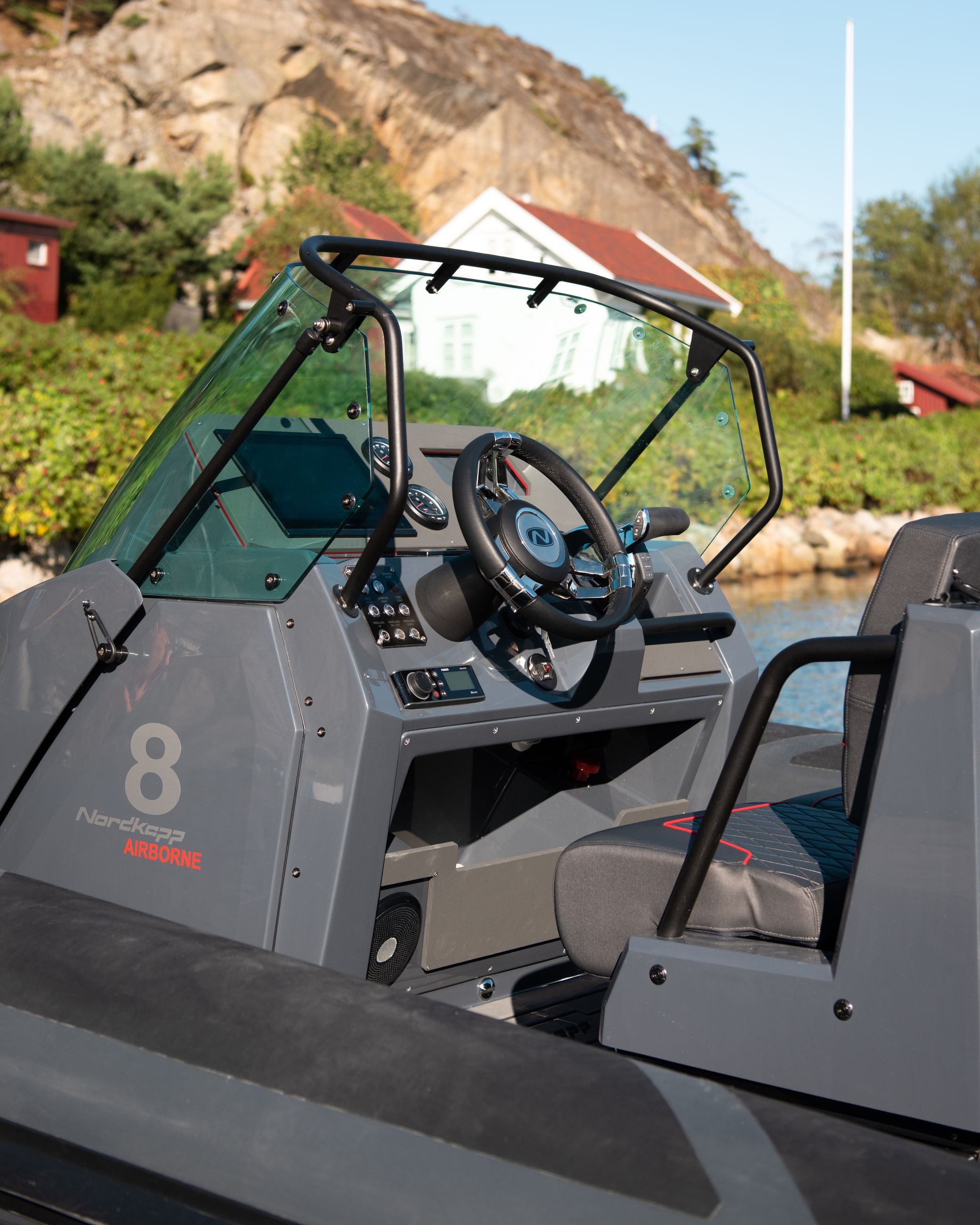 Konsollen i Nordkapp Airborne 8 er konstruert for nordiske forhold og den dekker deg godt slik at du er beskyttet mot vær og vind. Du har god plass til å passere både på styrbord og babord forbi konsollen.