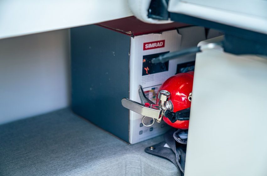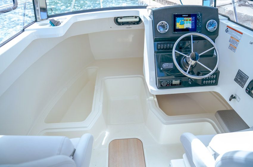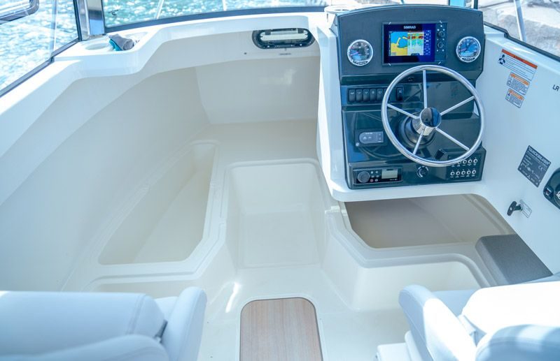Spol inn fisk etter fisk, holdt deg sikkert på dekk med babord og styrbord fotstøtte på 625 Pilothouse. Hold deg stødig med høyt fribord, og ta deg trygt til baugen med gangstien og takmonterte rekkverk. Dekket kan holdes ryddig og fritt for utstyr med innebygde oppbevaringsrom i kabinen, baugen og massive skap i gulvet. Enten du sitter i kabinen eller er på dekk, kan du navigere til ditt neste hete sted med Simrad-elektronikk av høy kvalitet.