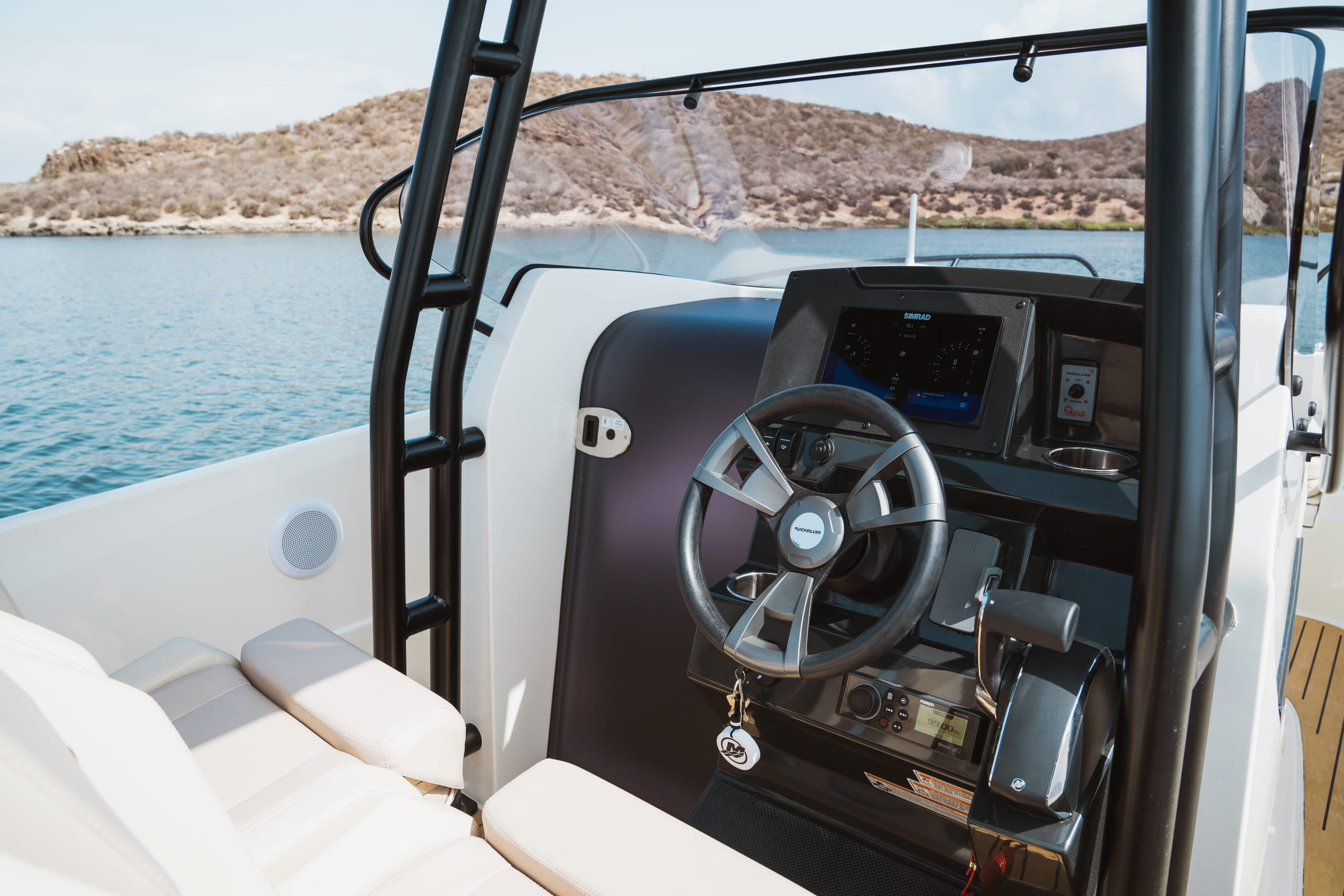 - SMART Edition utstyrspakke med bord og liten solseng (solseng i baugen som kan pakkes bort, puter i baugen), vannskistang, Fusion stereo med 2 høyttalere, dusj ute, elektrisk ankervinsj, forut, oppgradert cockpit-bord, fortøyningspakke