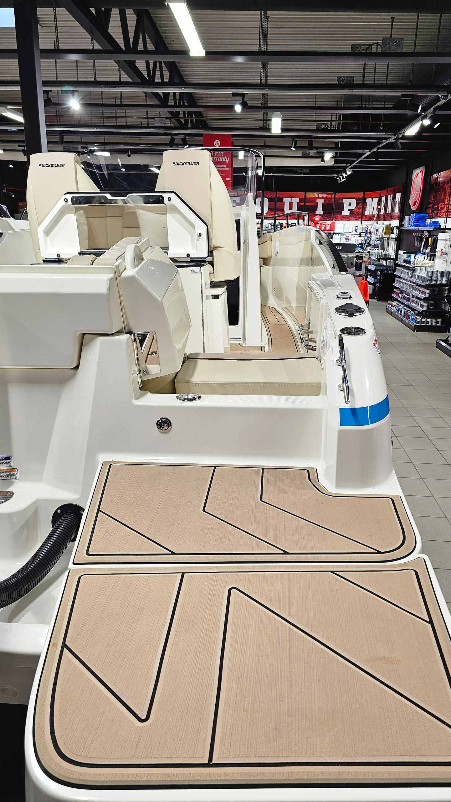 - Fiskepakke: Svart baug og vindskjerm, svarte rekkeverk på fribordet, hvitt skrog med egen skrogfolie for fiskeutgaven, fiskeområde, spylekran