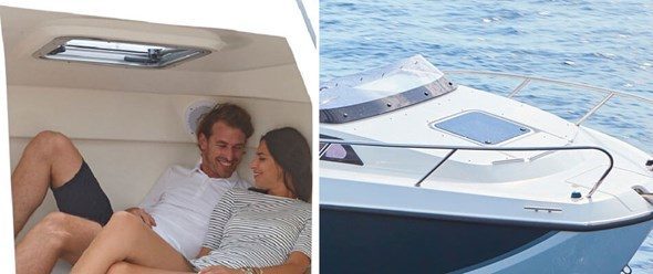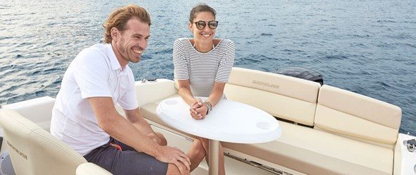 Quicksilver Activ 555 Cabin er en all-rounder året rundt. Du kan alltid slappe av om bord og bruke båten til det du liker aller best. Vendbare seter og bord som kan monteres omgjør cockpiten til en komfortabel spiseplass eller vil du kanskje heller bruke en del av cockpiten som solseng? Eller kanskje trenger du både bord og solplass? Da kan du bruke dekksplassen forut til å sole deg. Når det blir kveld, venter kabinen på deg. Du kan slå deg ned ved bordet eller omgjøre kabinen til en soveplass med bred dobbeltkøye som er to meter lang.