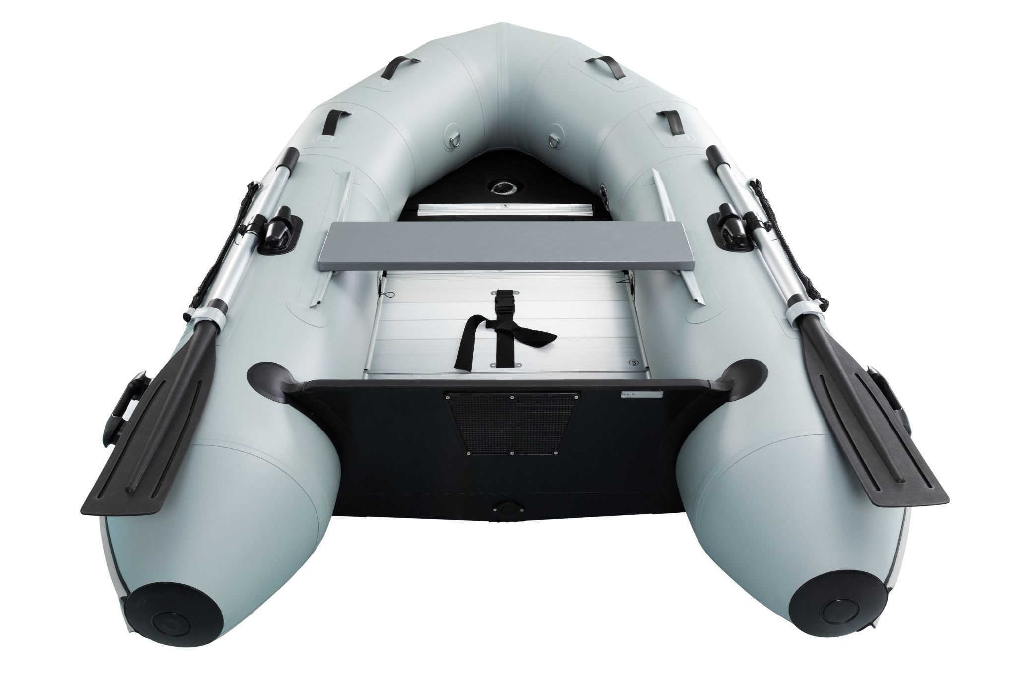 Leveres komplett med årer, kraftige håndtak på pontongene, aluminiumsdørk, forsterkede pontonger, syrefaste D-ringer utvendig, kraftige rekkeliner, pumpe, rep. sett, m.m.