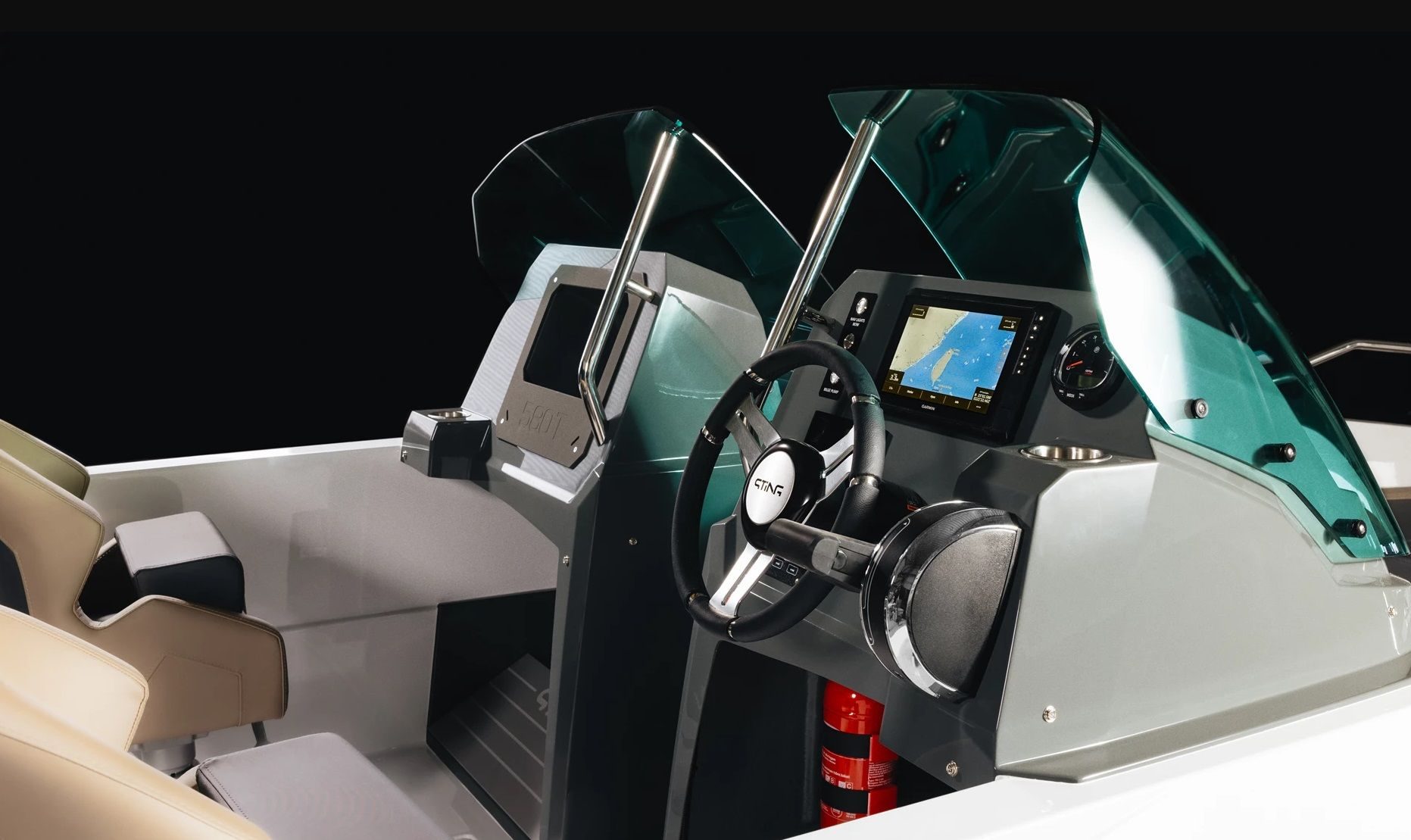 Den doble konsollen i Sting 580 T gir også økte praktiske muligheter, som en sentralt plassert passasje og gjennomgang for å bevege seg fra akter til baug.