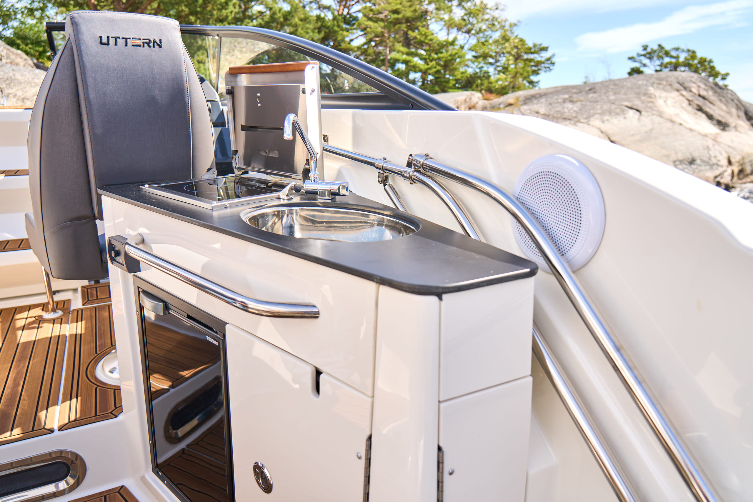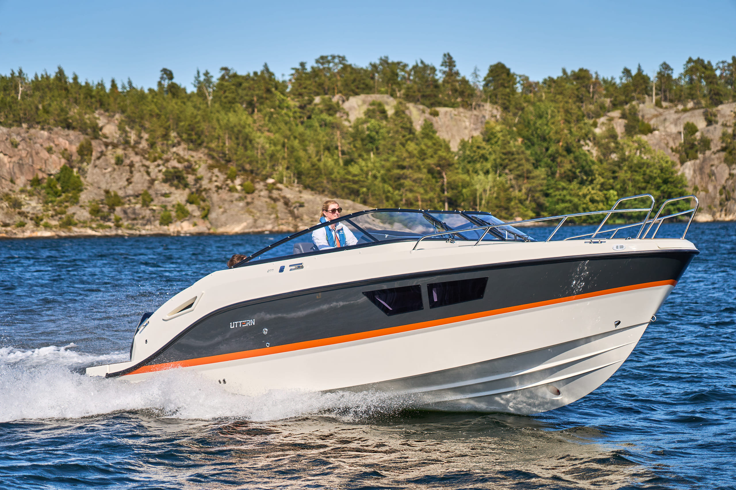 Uttern D77 er en stilig og moderne daycruiser for inntil 9 personer, og tilbyr flere konfigurasjoner for fritidsbruk med familie og venner. Den har meget gode sjøegenskaper, og vindusviskere og defroster bety at du kan nyte D77 i de fleste værforhold, og gjennom hele året.
