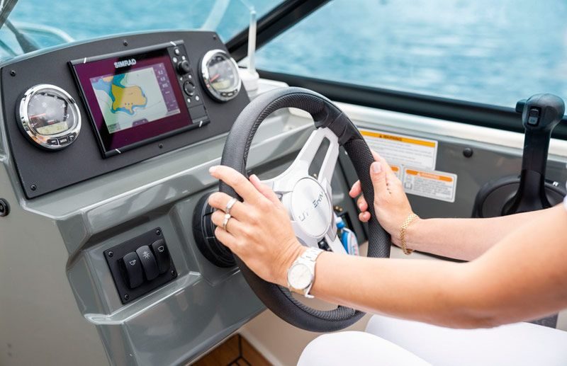 Som Uttern T53s skipper kan du fornøyd håndtere sportsrattet med standard hydraulisk styring, en sjelden detalj på en båt i denne størrelsen. Den ergonomiske styreposisjonen er også utstyrt med komfortable seter som svinger, integrerte fotstøtter og SmartCraft instrumentering.