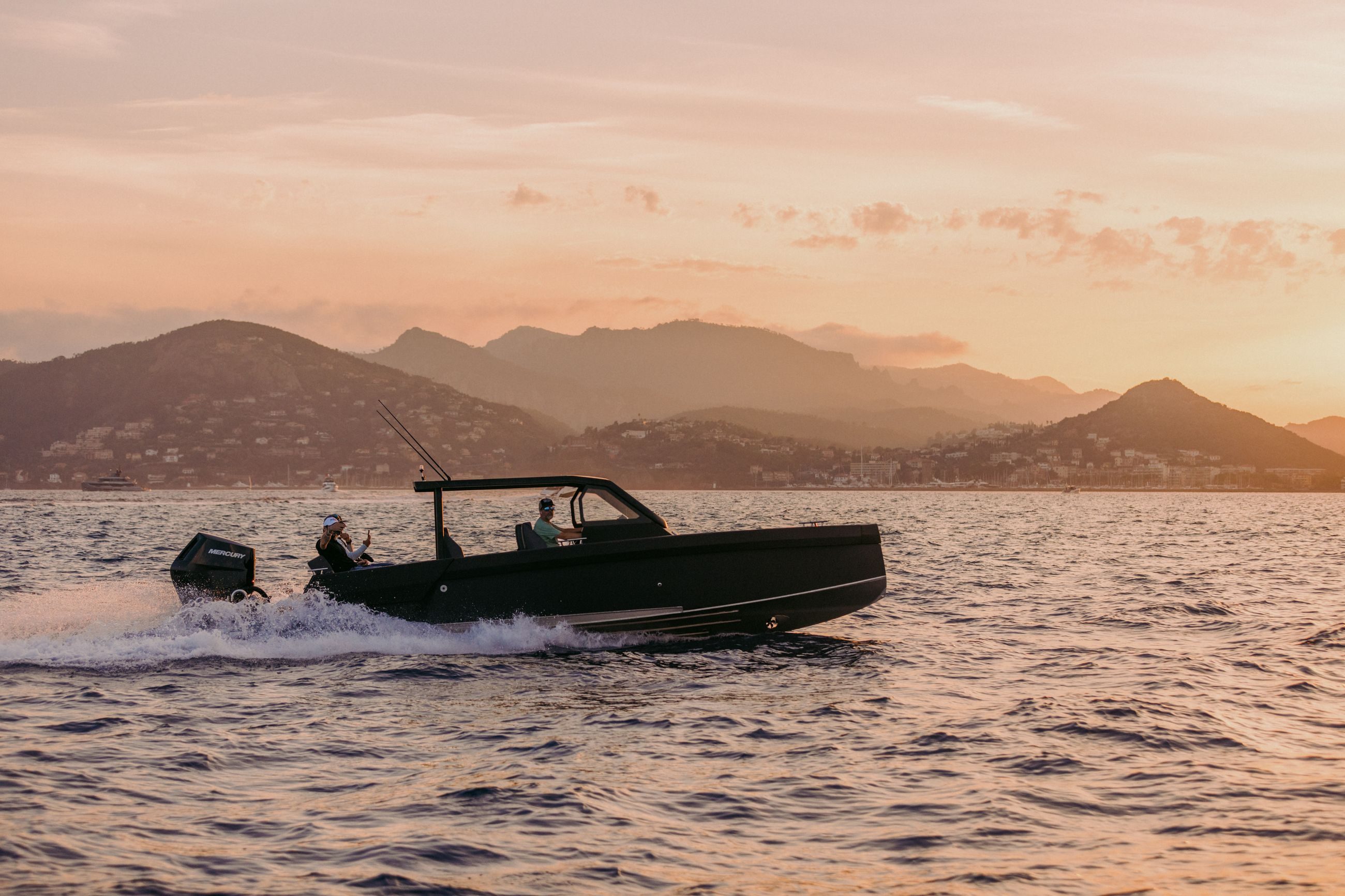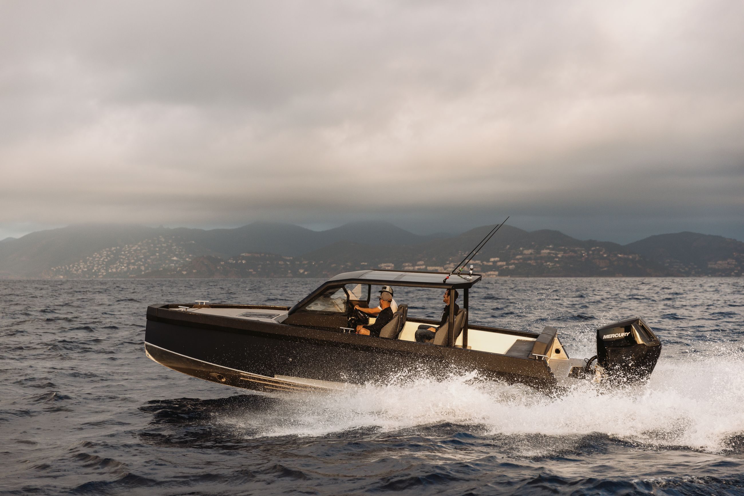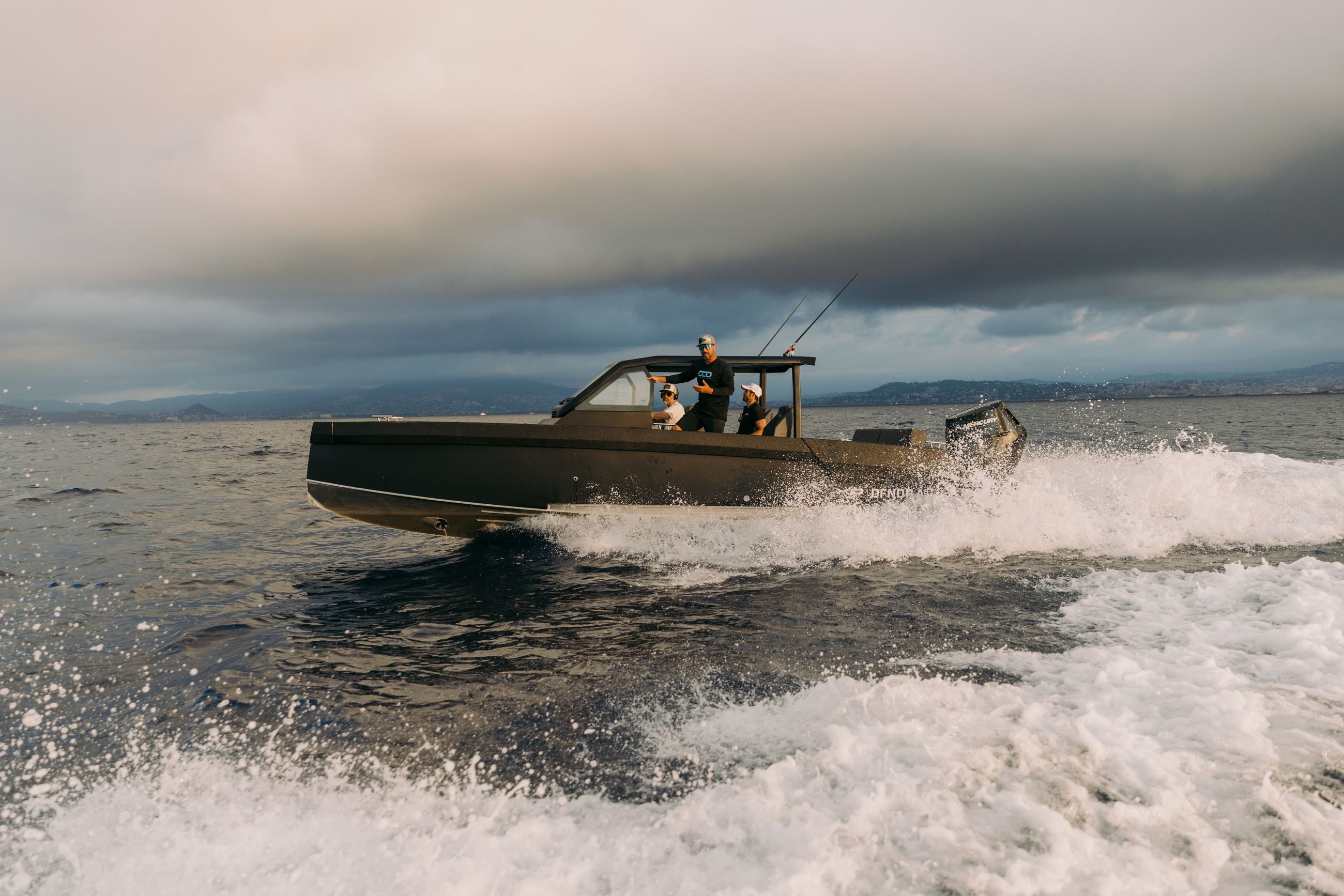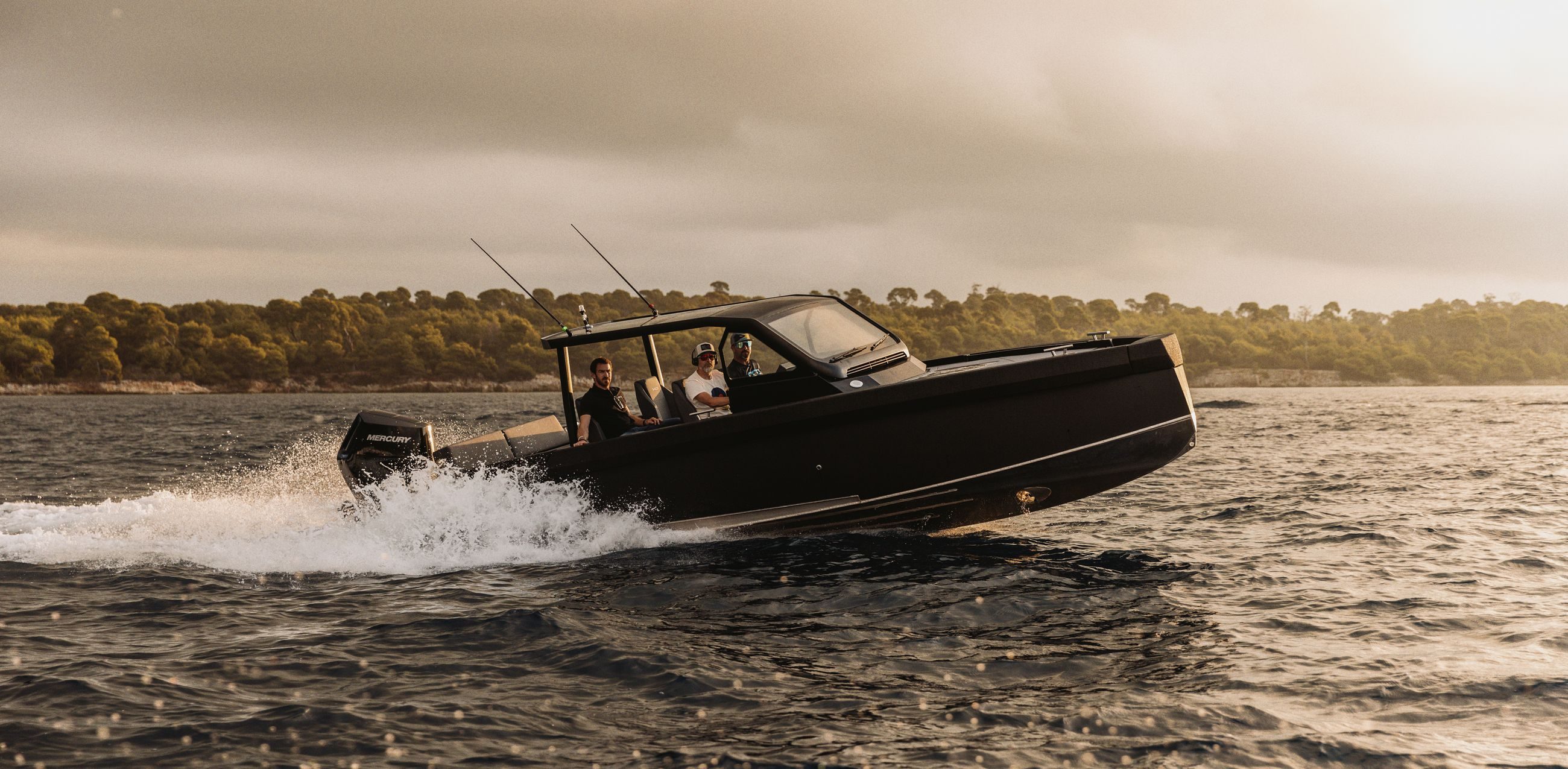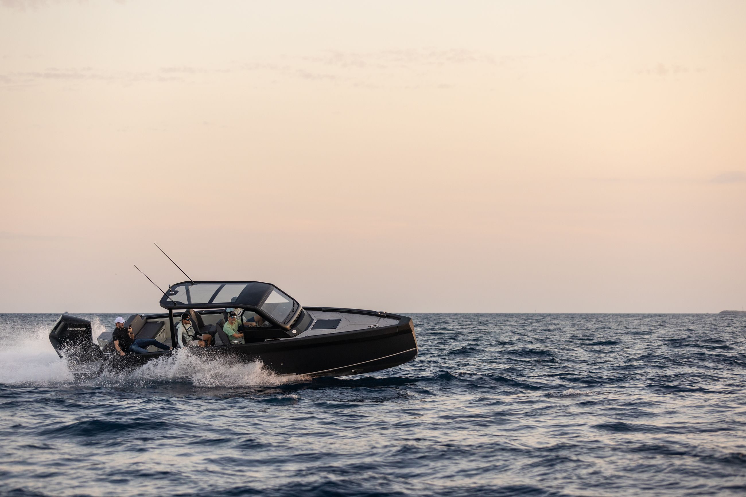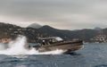 Båten kan utstyres med 2×225 hk og 1×400 V10, som når opp til +50 knop i fart.