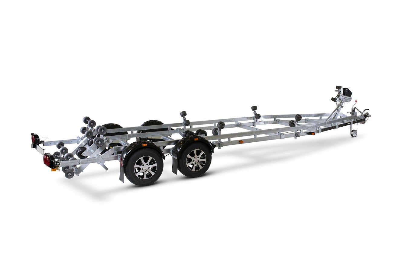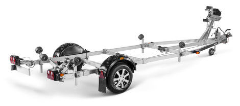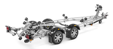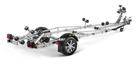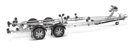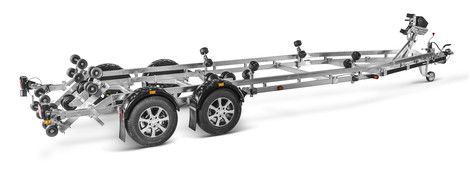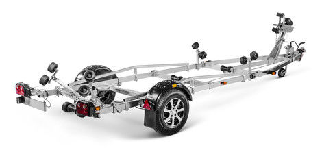 For store, tunge båter kreves det litt ekstra når man skal finne gode transportløsninger og optimal kapasitet. Våre bremsede hengere sikrer at du får en stabil tur, takket være det V-formede tilhengerdraget som går helt fram til kulekoplingen. Vanntette hjullagre er standard. Optimalt kuletrykk får du ved å tilpasse tilhengeren til den justerbare hjulakselen. For ekstra beskyttelse og smidig lasting og lessing kan du redusere belastningen på skroget med våre Premium og X-line ruller. Vognen som er vist på bildet kan ha ekstrautstyr.