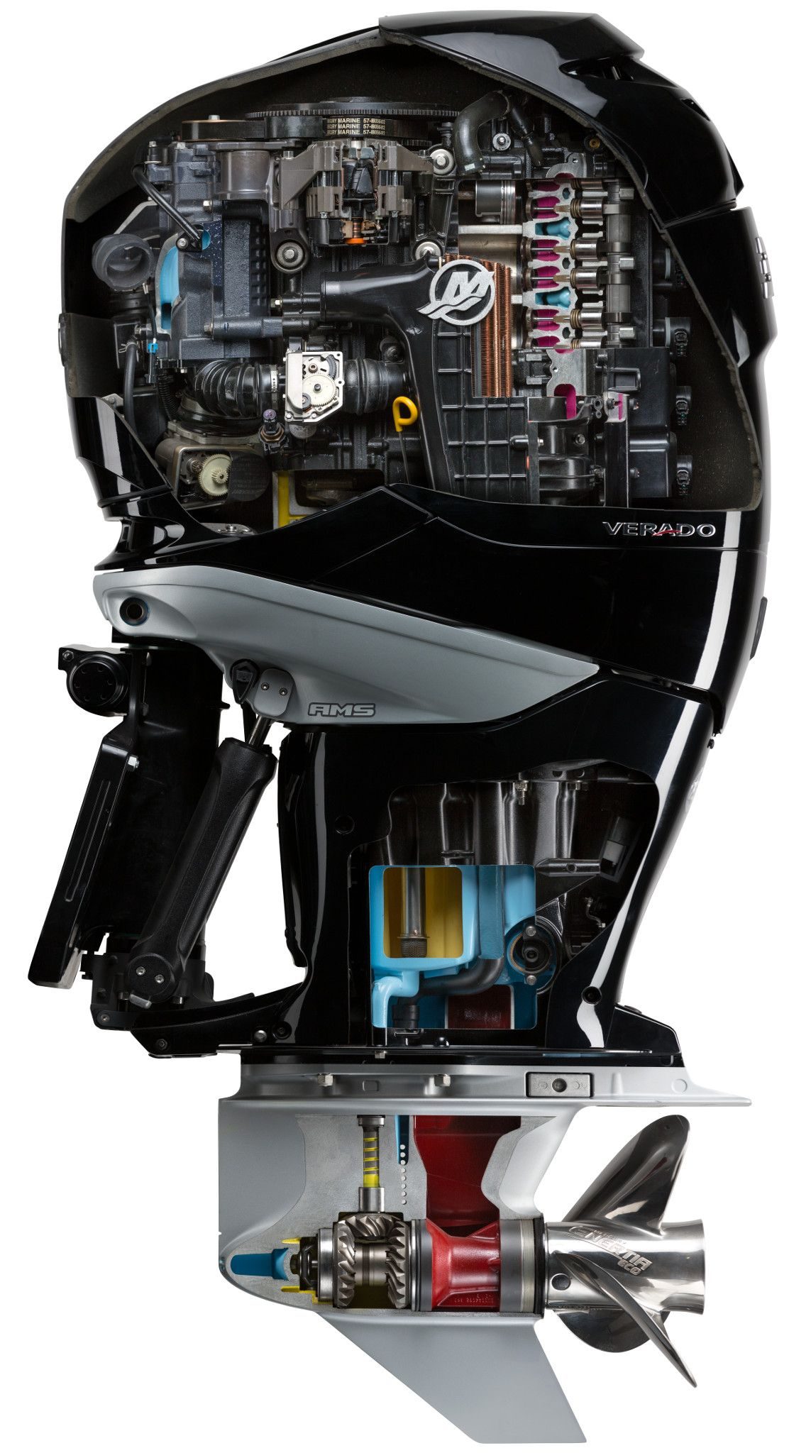 Den Mercury-eksklusive Advanced MidSection (AMS) og støydempingen under dekselet setter standarden for rolig og stille fremdrift på vannet. De nye, spennende Mercury Verado V8 utenbordsmotorene har en stram, dristig innpakning som sender et klart budskap på enhver båthekk.
